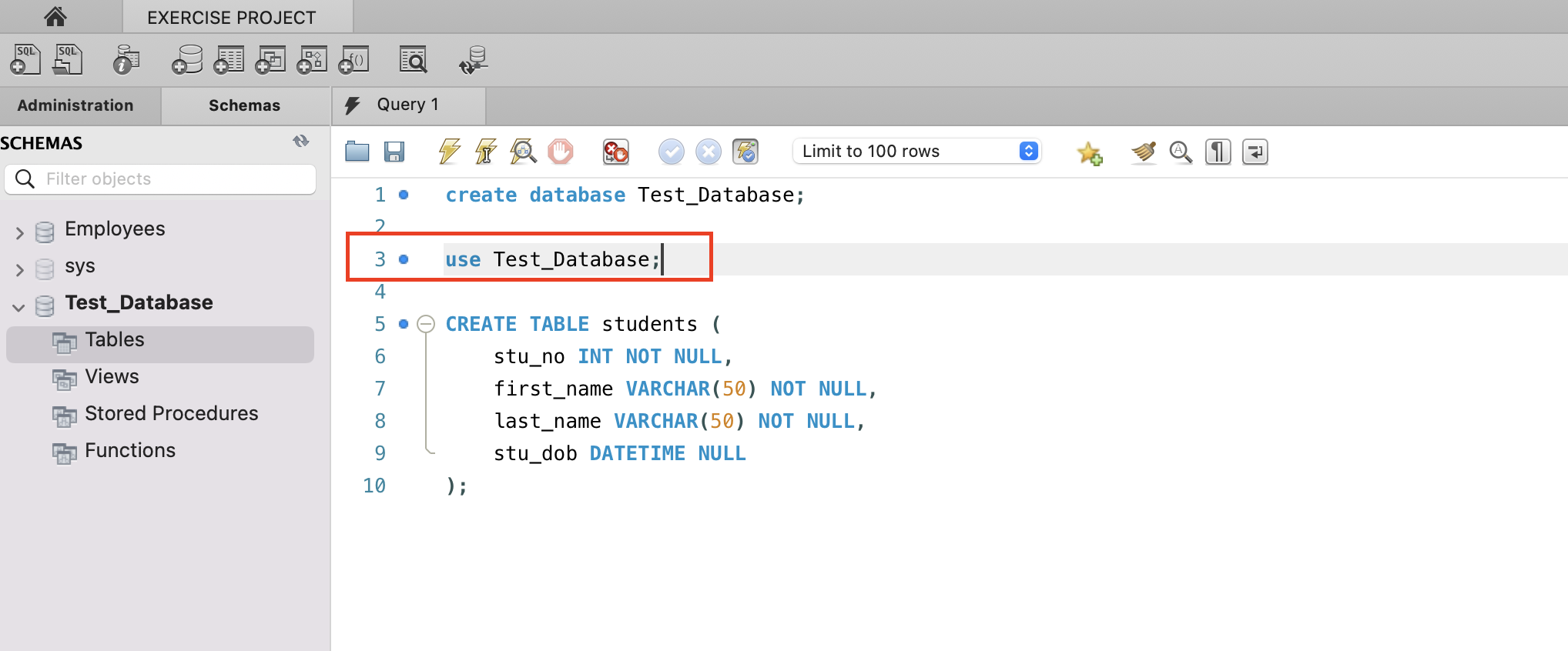 자 우선, MYSQL을 시작하려면, 데이터베이스가 있어야 합니다. 데이터베이스는 앞서 이야기했다시피, 테이블들의 묶음인데요, 테이블을 만들기 위해서는 데이터베이스가 먼저 존재해야 합니다. 지금 좌측에 보이는 Employees는 제가 기존에 공부할 때 사용하던 Database인데요, 지금 제가 적어놓은 작업문을 먼저 보겠습니다.