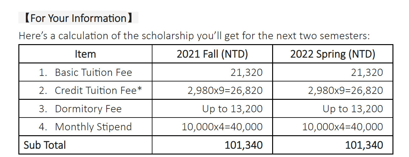 대학에서 자체적으로 지원하는 장학금은 보통 성적 장학금이라 부르고, 입학 시에 학부생 성적 등 여러 자료를 통합해서 장학금을 지원합니다. 사실 제가 대만 대학원을 가장 처음 지원했었고, 그 후로 타지역 석사들을 알아봤는데 굉장히 놀랐던 점이 있습니다. 대만 대학원의 경우 거의 대부분의 학교에서 제법 많은 인원에게 수업료 면제 및 월 생활비 지원이라는 장학금을 주는 것에 반해, 다른 나라에서는 그렇게 장학금을 주는 경우가 정말 드물더라고요.