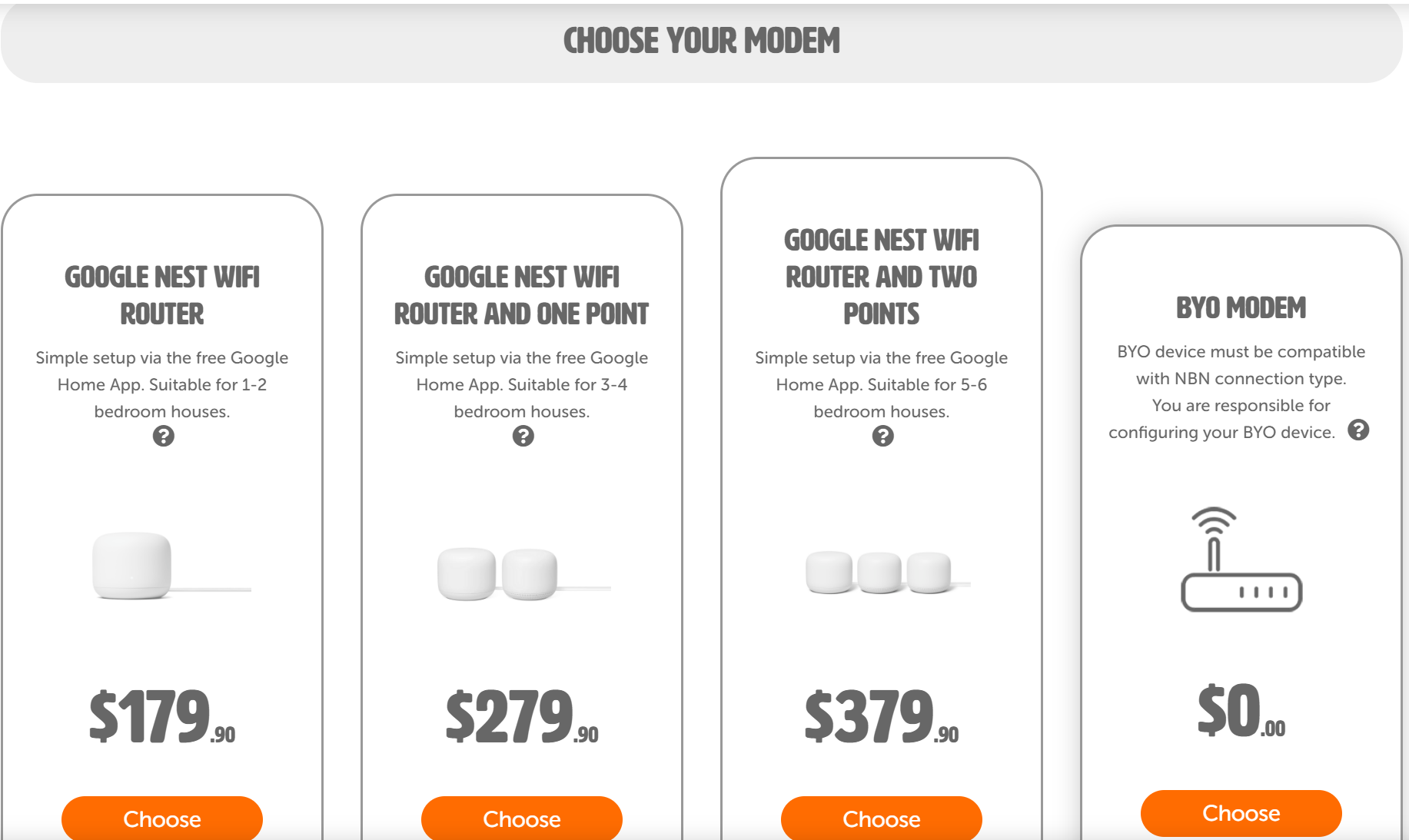 요금제를 선택하고 나면, Modem을 선택하라고 나오는데요, 모뎀이 너무 비싸죠? 이게 구글 제품을 써서 그런 거 같은데요, 저도 구글 네스트 제품은 사용해본 적이 없지만, 인터넷 와이파이 공유기 하나에 15만원 상당을 들이고 싶지는 않았습니다. 그래서 저는 맨 오른쪽에 BYO(Bring Your Own)모뎀, 즉, 제가 가지고 있는 모뎀을 쓰겠다고 선택했어요.
