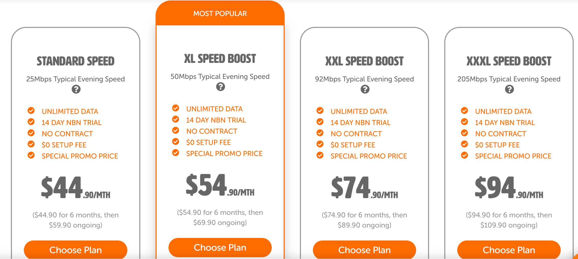 탠저린은 NBN과 모바일 요금제 모두 가지고 있는데요, 저는 모바일 요금제는 Optus가 좀 더 저렴해서 이용 중입니다. 그래서 NBN만 선택. 저는 월 54.9$ 요금제를 선택했는데, 이게 속도가 50Mbps이고, 데이터 사용량에 제한이 없는 무제한 요금제여서 선택했어요. 10달러 더 싼 25Mbps는 아무래도 느릴 거 같더라구요. 한국에서 200~300Mbps까지도 올라가는 인터넷을 느끼다가, 25Mbps를 쓰면 좀 답답할 거 같았어요. 게다가 저희는 둘이지만, 전자기기는 제법 다양하게 사용하거든요.